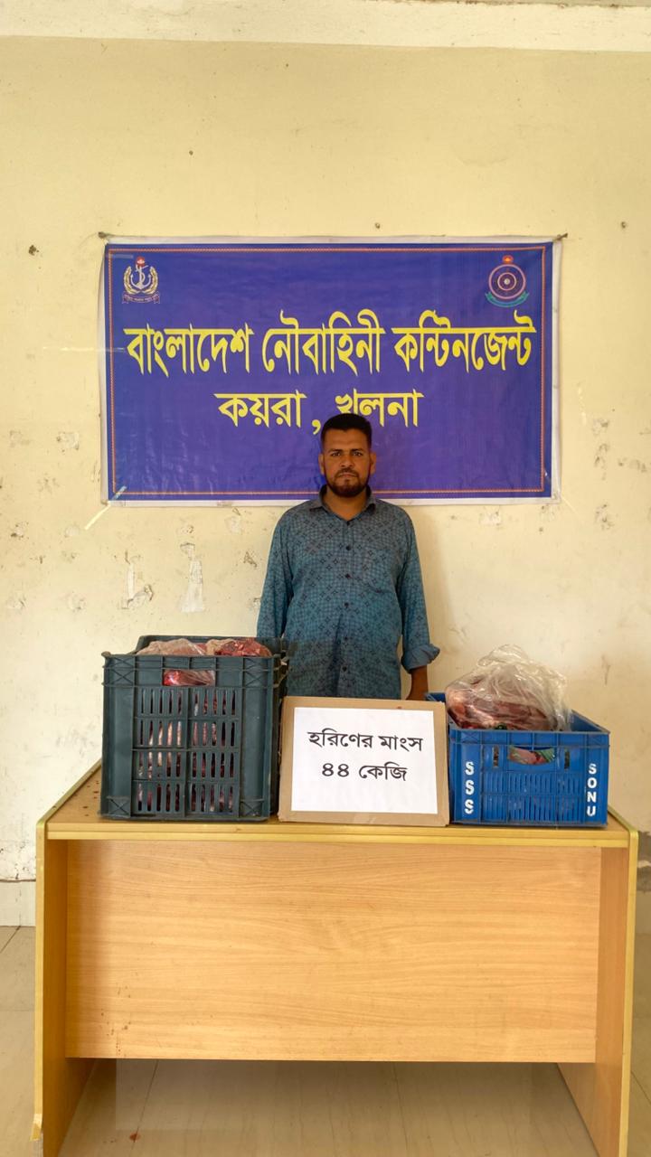 খুলনার কয়রা উপজেলায় নৌবাহিনীর অভিযানে ৪৪ কেজি হরিণের মাংসসহ একজনকে আটক...